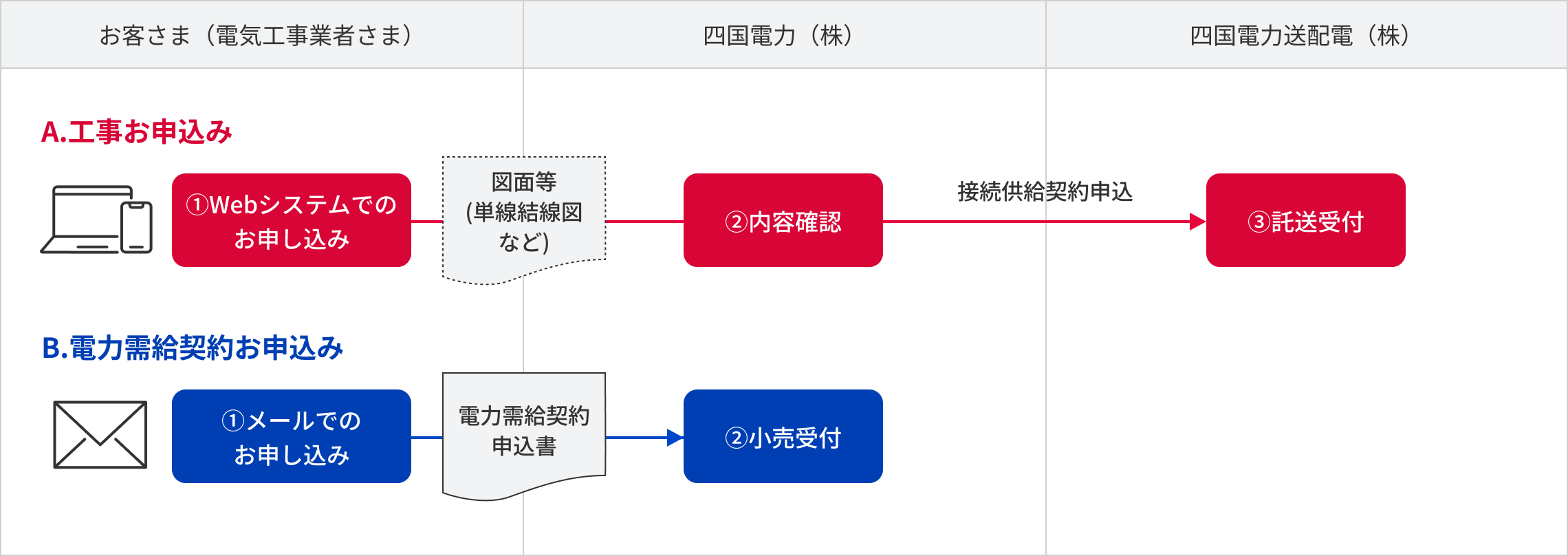 新設・増設(契約電力または契約受電設備の増加)・一部廃止(契約電力または契約受電設備の減少)の際には、Webシステムによる「A.インターネット託送工事申込み」およびメールによる「B.電力需給契約お申込み」をお願いします。