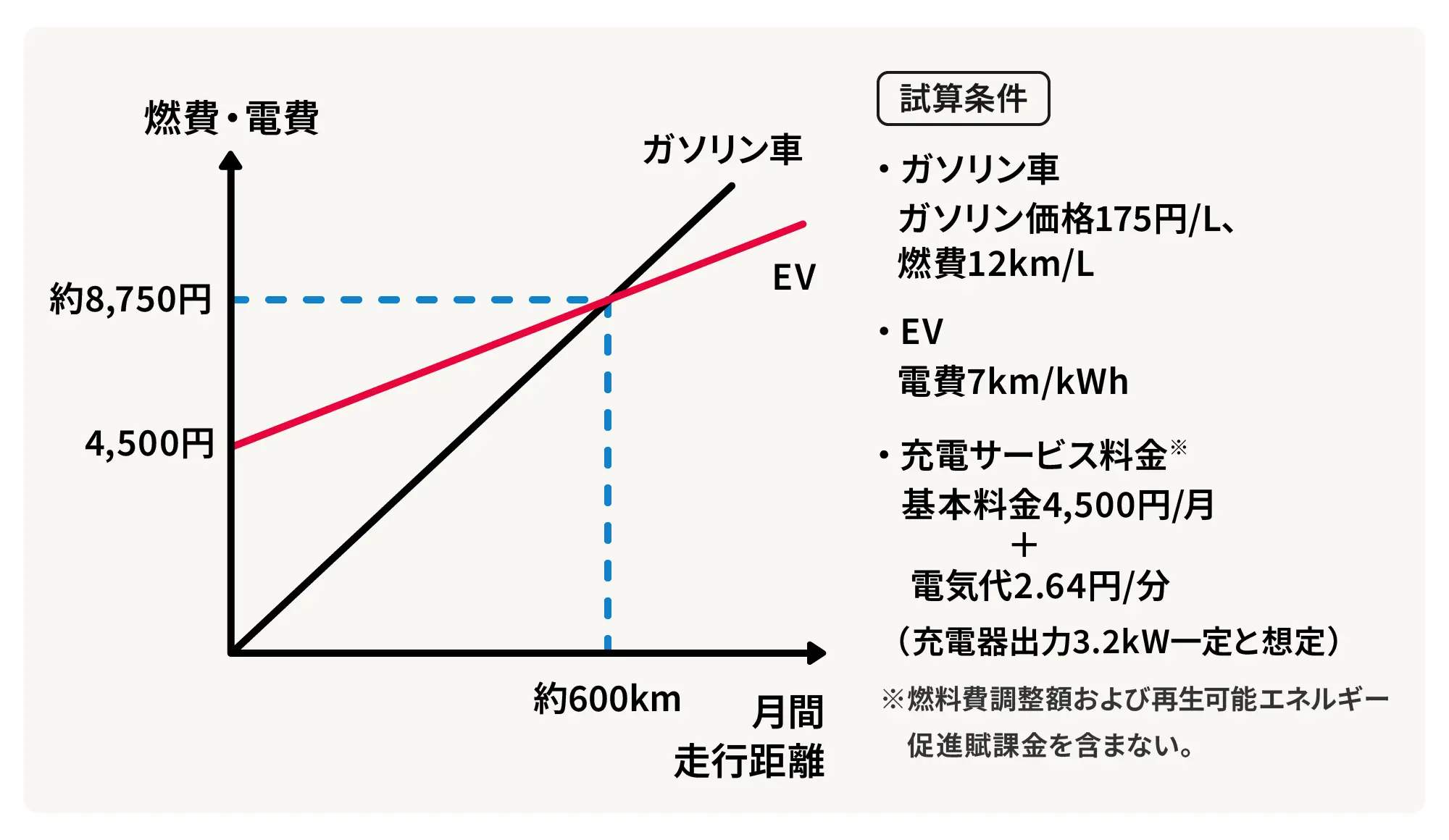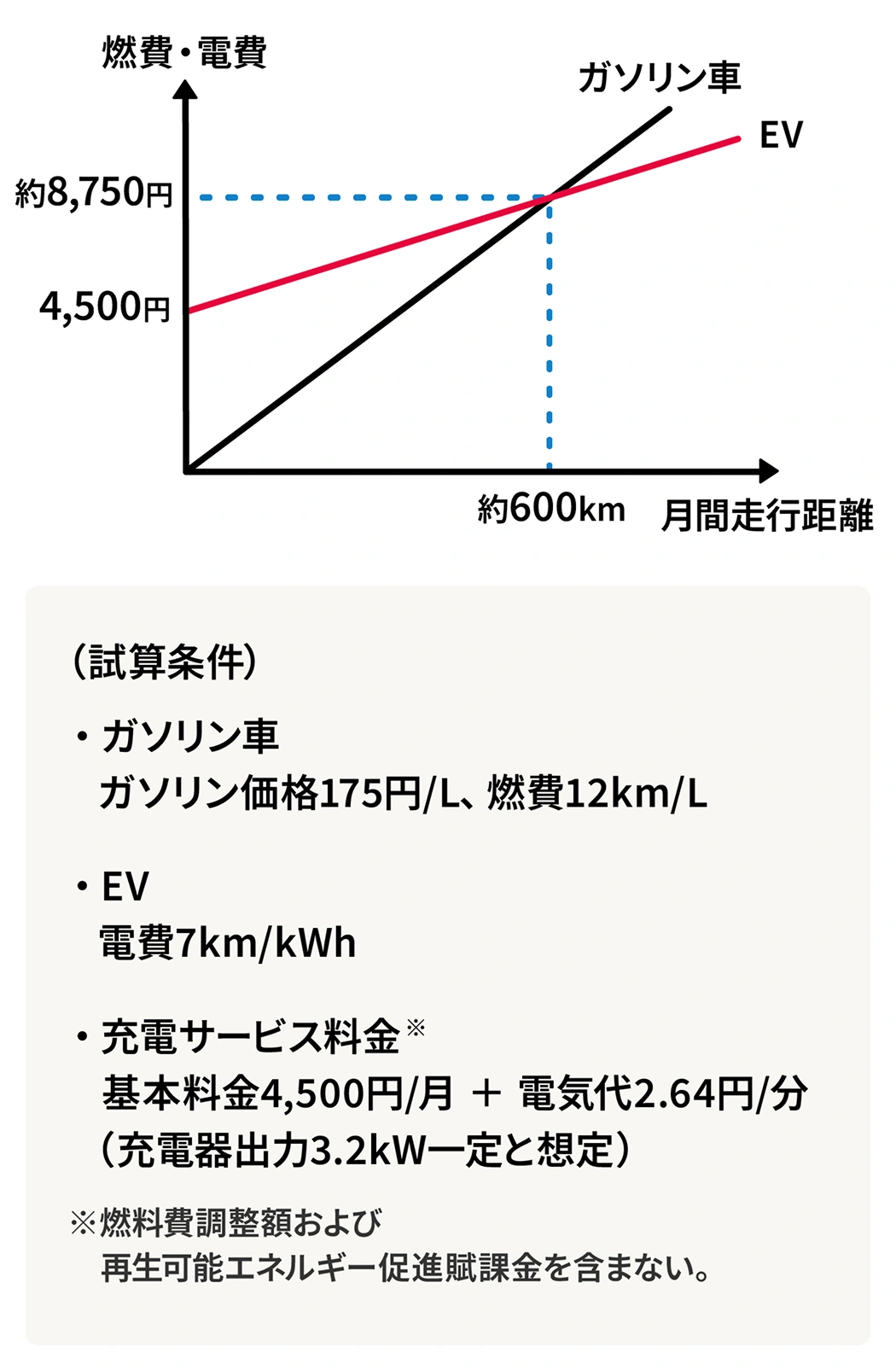 (再生可能エネルギー発電促進賦課金および燃料費調整額は別途かかります) - 月600km以上のご使用でガソリン車に比べ本サービスがおトクになります。
