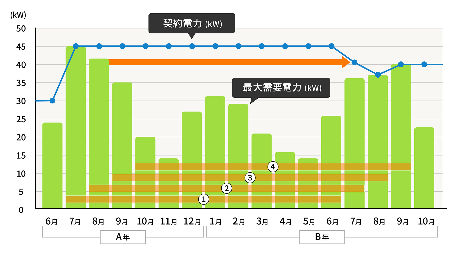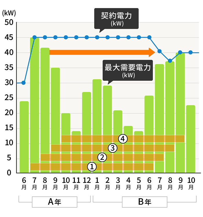 A年7月~B年6月の間で最も大きい最大需要電力は、 A年7月の値となるため、契約電力はA年7月の最大需要電力の値となる。 |