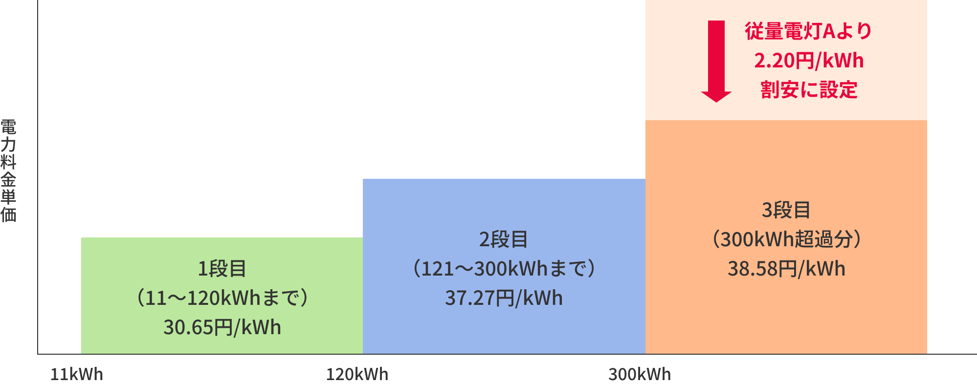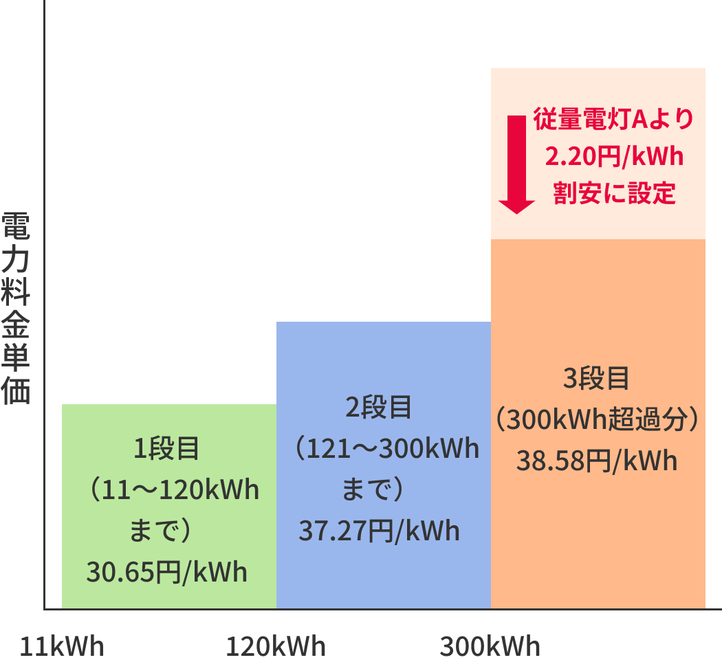 - ご使用量に応じて三段階に分かれている料金単価のうち、三段目単価を割安に設定しております。