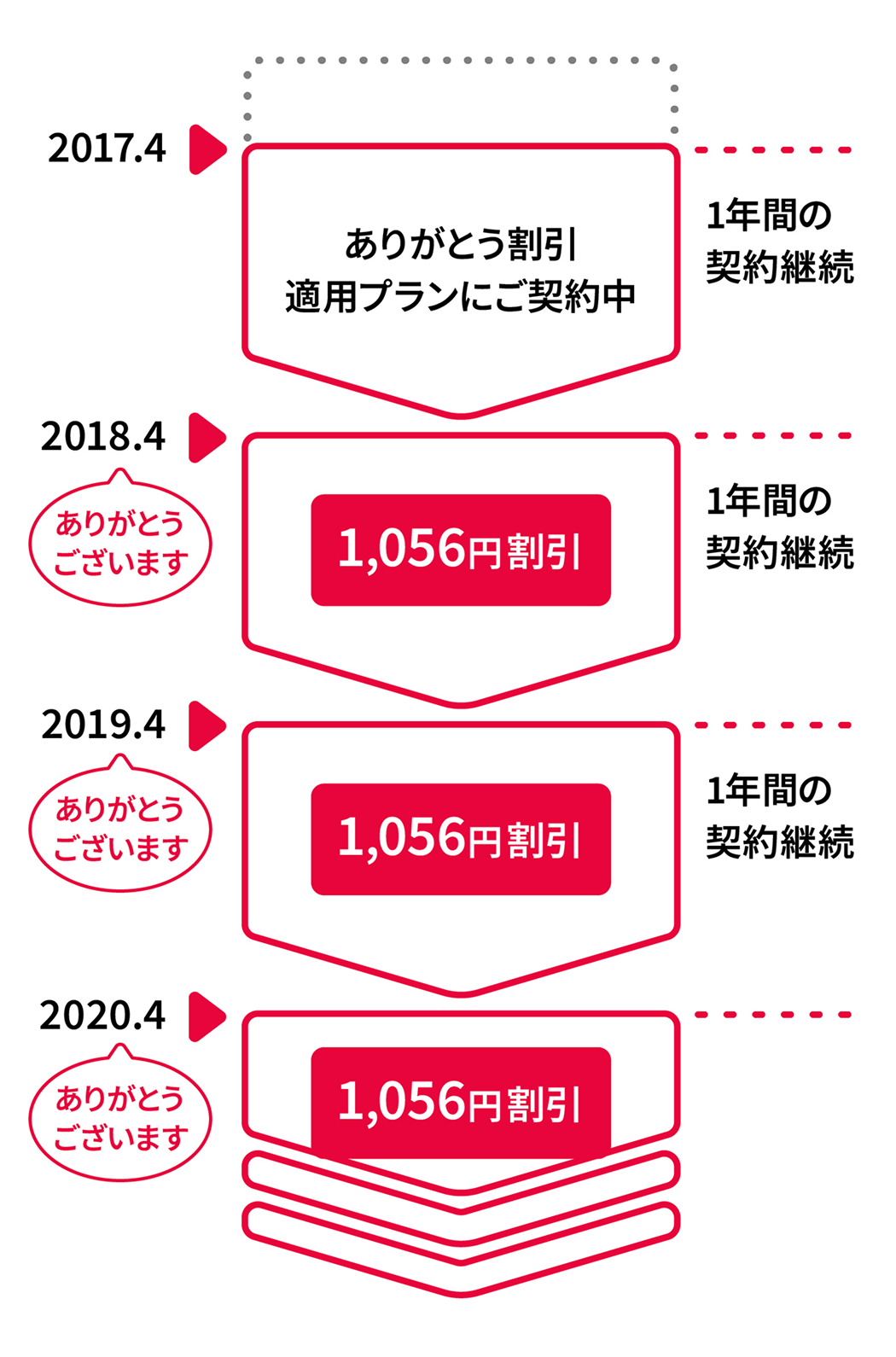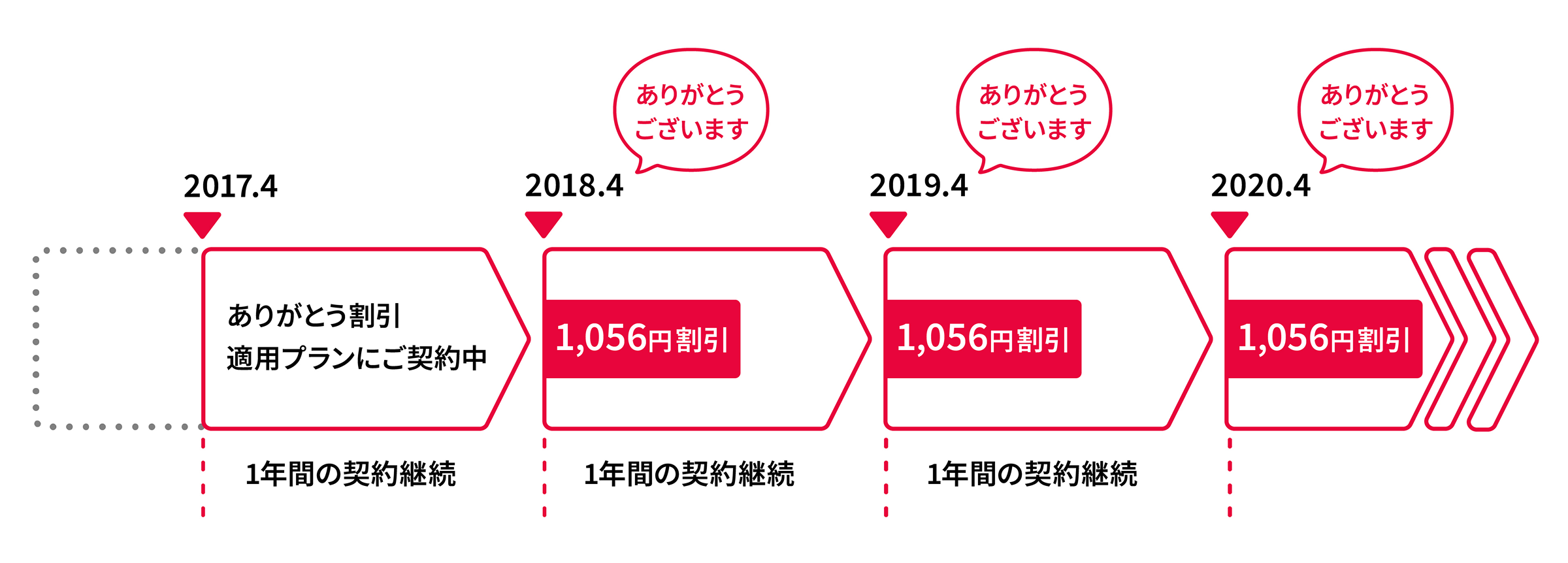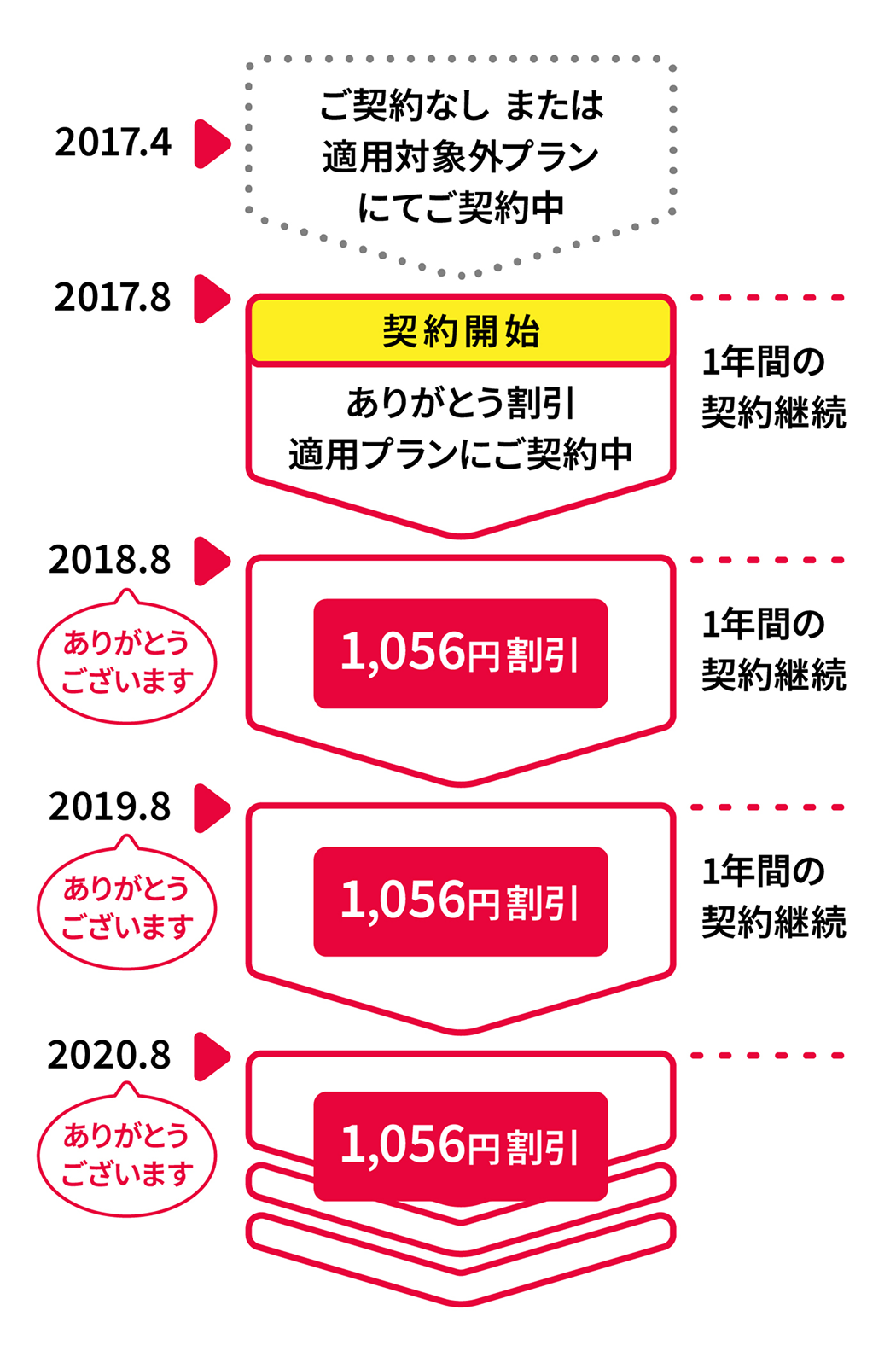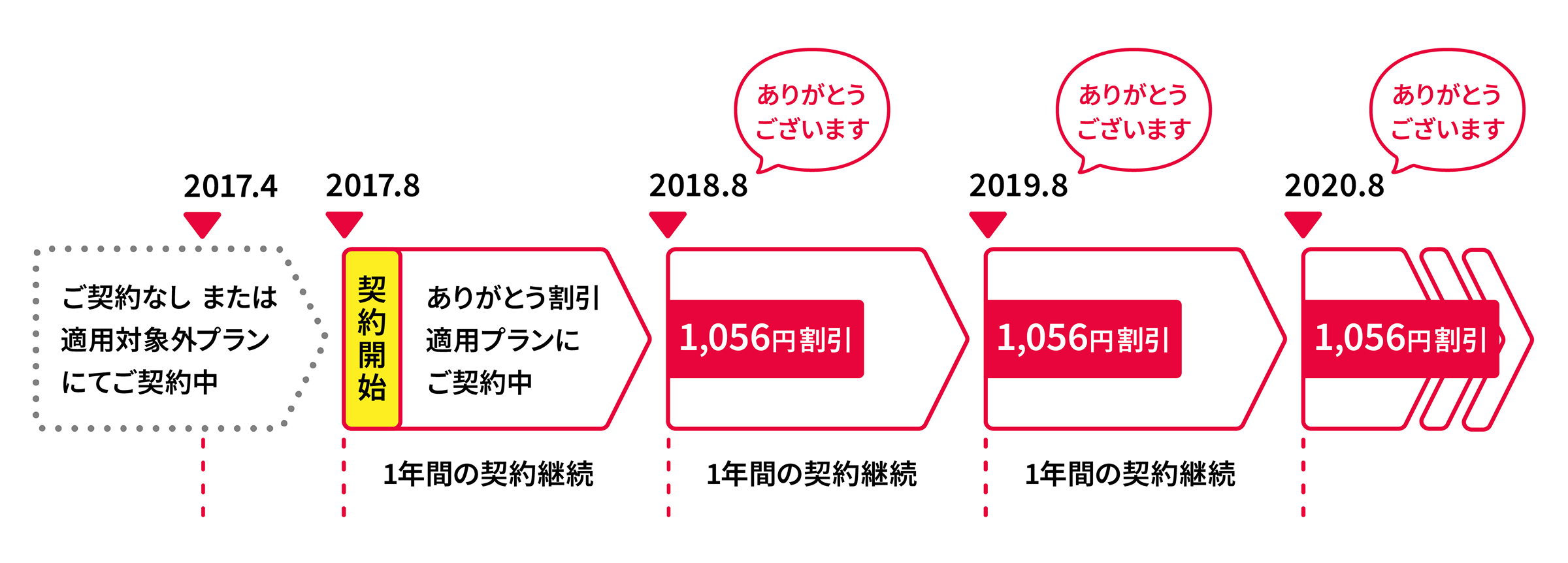 - 2017年4月以降に、「ありがとう割引適用プラン」にご加入された場合のご契約継続起算日は、そのご加入日といたします。