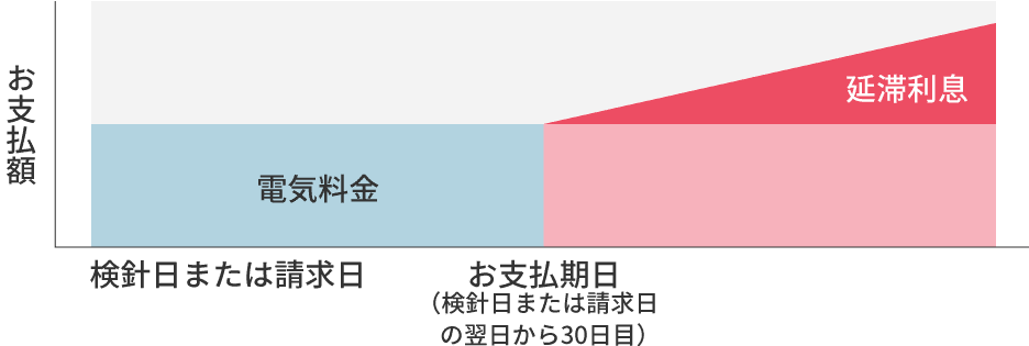 お支払い期日(検針日または請求日の翌日から30日目)を経過してお支払いいただいた場合に、その経過日数に応じて年利10%(1日あたり約0.03%)の延滞利息をいただく制度です。
