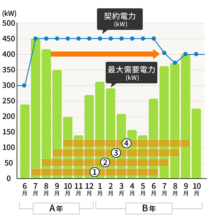 A年7月~B年6月の間で最も大きい最大需要電力は、 A年7月の値となるため、契約電力はA年7月の最大需要電力の値となる。 |