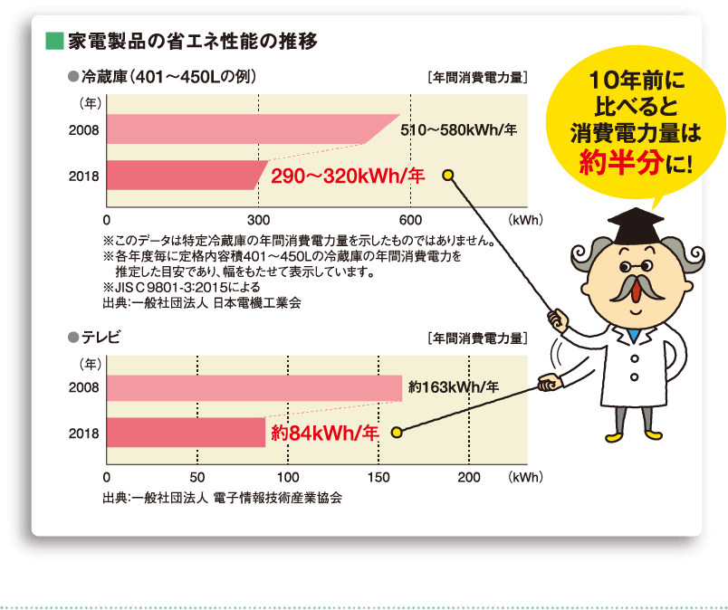 家電製品の省エネ性能が大幅に向上したことも電気の使われ方が変化した要因です。ご家庭でよく使われている冷蔵庫やテレビの消費電力量は、10年前と比較すると、大幅に減少しました。