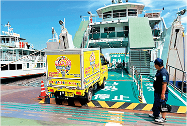 正午前、トラックを乗せたフェリーが大島港に近づくと、すでに10人ほどがすぐ脇の広場に集っていた。トラックが到着するのを待ちかねたように、カゴを手に買い物をする利用客。他の人の買い物を手伝っていた女性は「店員さんだけでは大変やからね。手が届かないところの商品を取ってあげたり、品物を整理したりするのが楽しみ」とにっこり。「買い物に行くんも車に乗らんようになるとなかなか…。近くに来てくれるから助かる」と食料品の入った大きな袋を抱えた女性も言う。