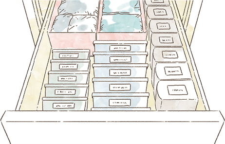 深さのある引き出し式の冷凍庫は、ものが次々と積み重なることで、底にあるものの使い忘れにつながってしまいます。ここでは、立てて収納して、開ければすべてが見渡せるようにすることがポイントです。ブックエンドや冷凍庫収納専用のフリーザーエンドを活用したり、収納ボックスで細かく仕切ったりすると、立てて収納しやすくなります。