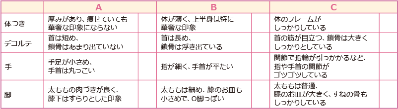 私たちが生まれながらに持つ、体のライン、筋肉や脂肪のつき方、骨や関節の大きさの特徴から、似合うデザインや素材、柄を導き出すのが骨格診断です。自分の骨格のタイプを知り、似合う服を選ぶことでスタイルアップが叶い、グッと垢抜けた印象になります。まずは、自分がどのタイプかを鏡を見ながらチェックしてみましょう! 身長や体重などは関係ありません。自分の体の特徴がよく分からない!という場合は、周りの方やご家族、お友達とも比べてみてくださいね。