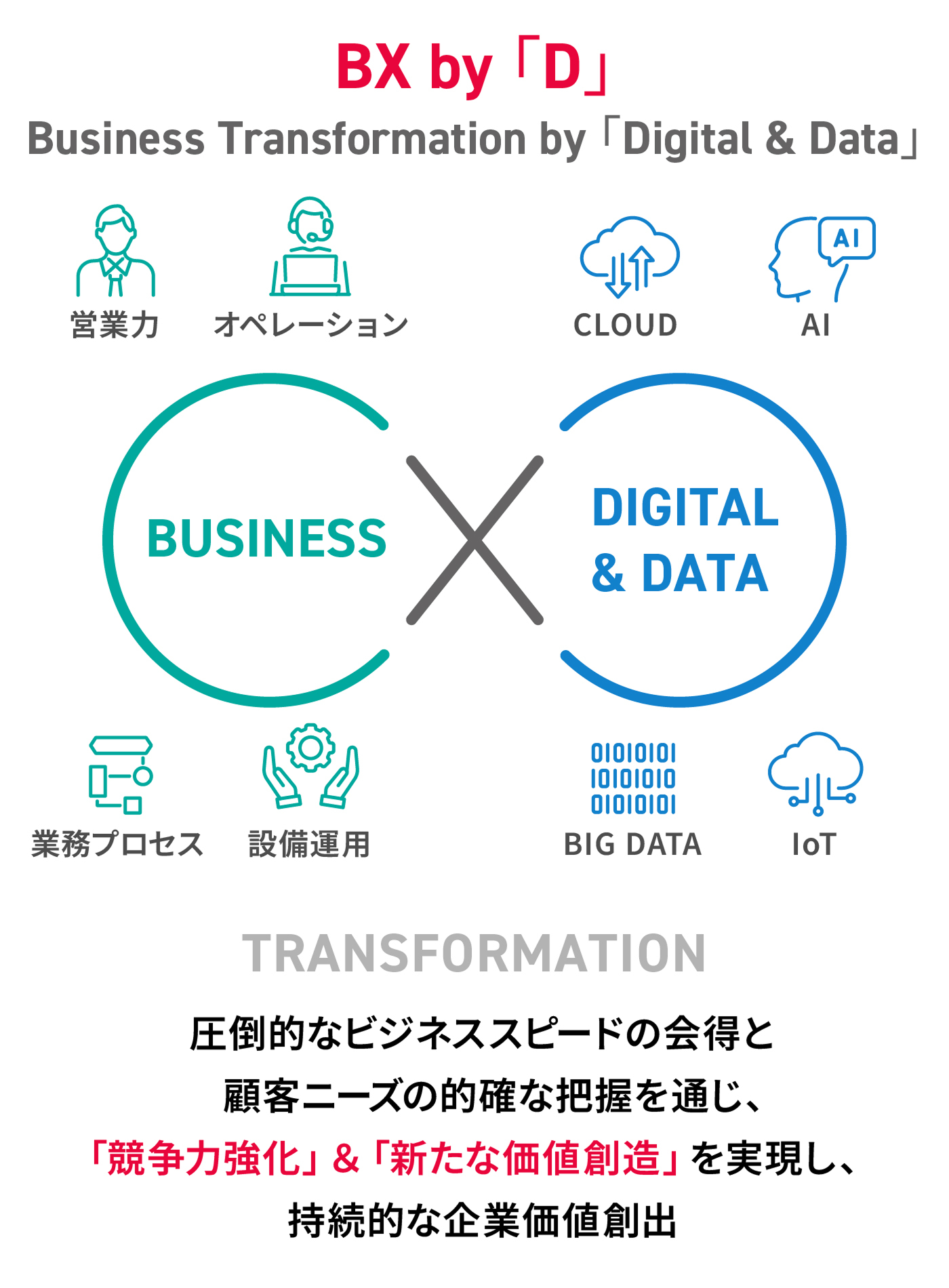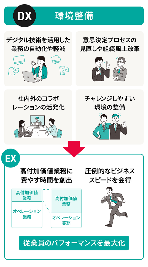 BX by 「D」を実現するために、以下のとおり、「環境整備」と「取組実践」を大きな柱として、従業員のパフォーマンスの最大化と既存サービスの高付加価値化や新サービスの創出による価値創造にチャレンジしていきます。