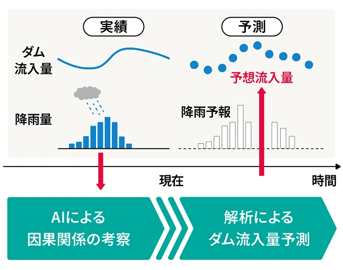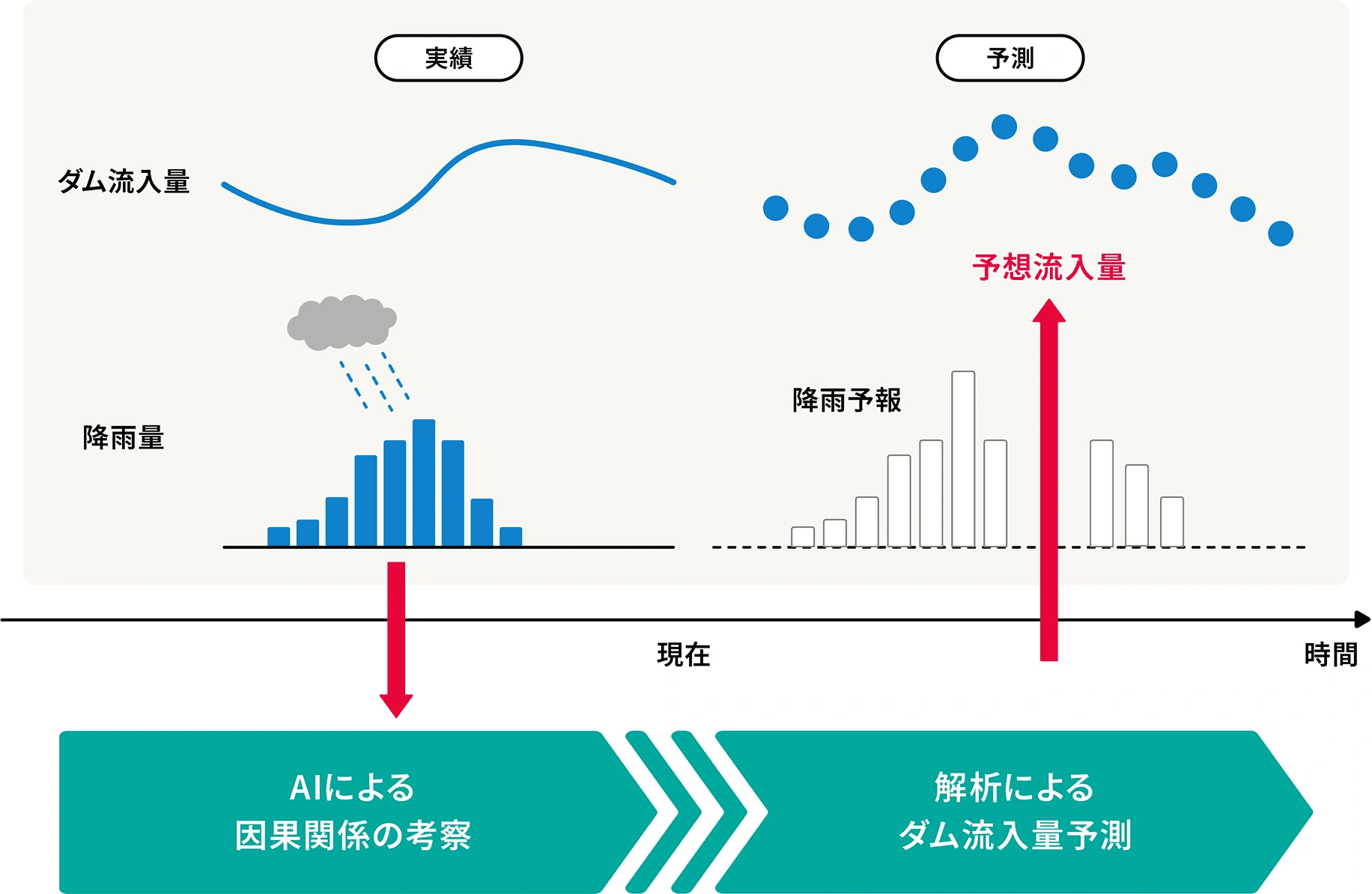 しかしながら、近年増加している局地的な集中豪雨などにより、予測業務が複雑化していることから、流入量予測業務の高度化を目指し、放流開始の判断に際して、重要な要素である「数時間先までのダム流入量の変動」にAIを用いた予測手法を開発し、ダム管理への導入を行いました。