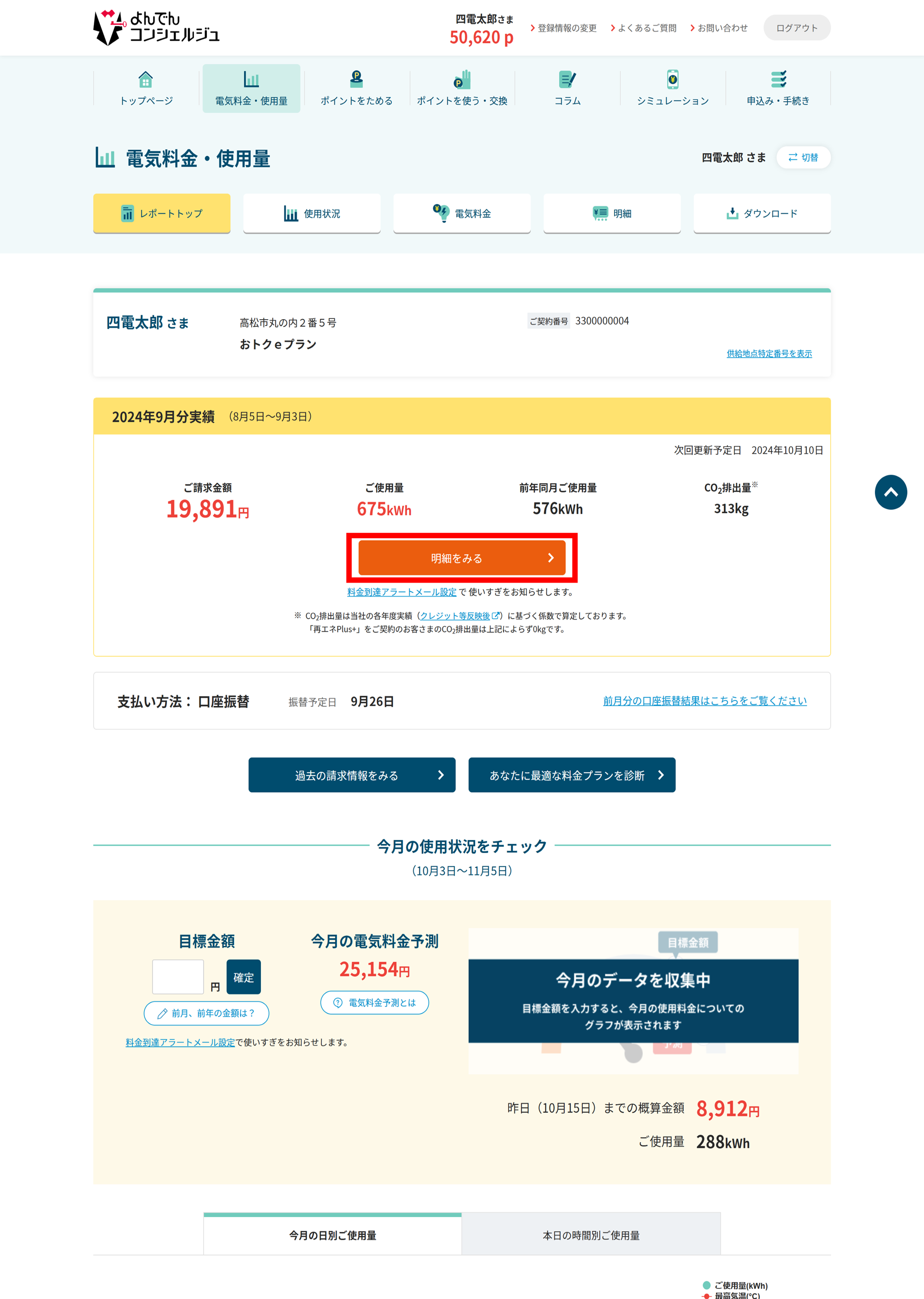 1.よんでんコンシェルジュにログインし「電気料金・使用量」を押します。