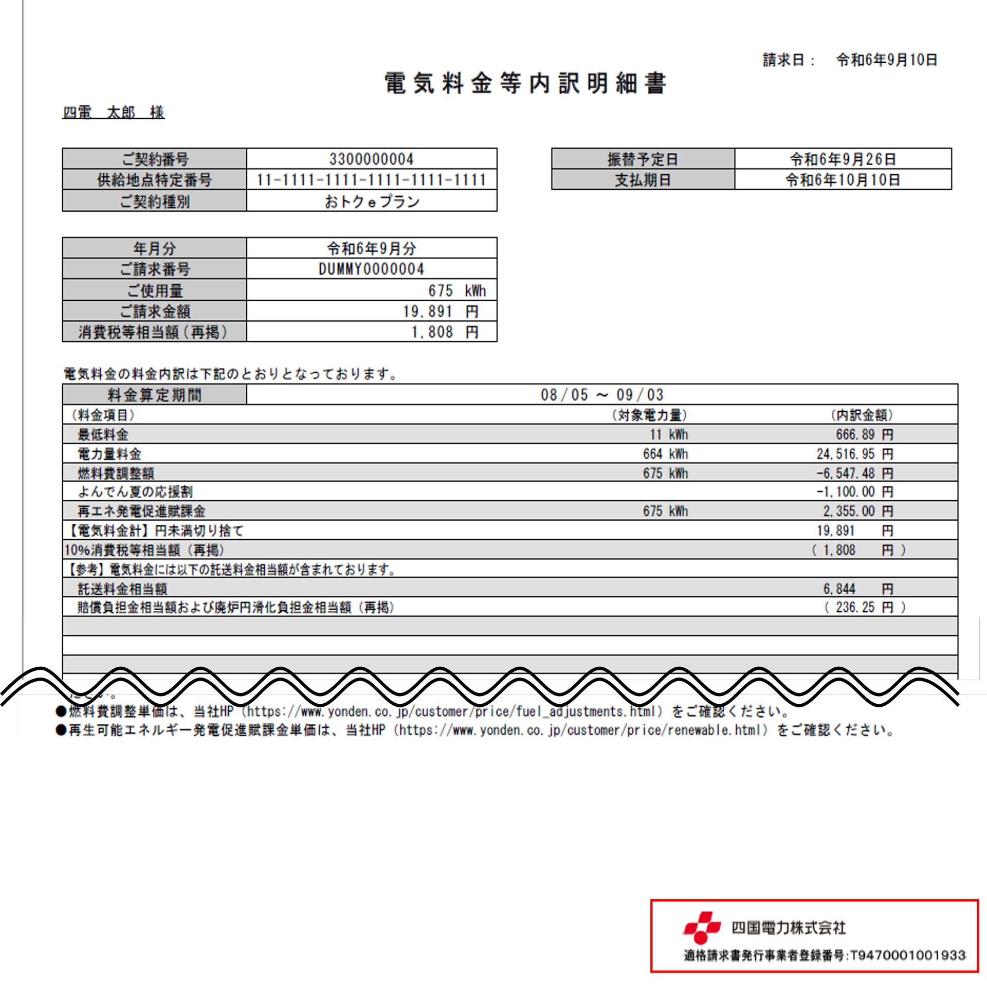 拡大できます 4.生成された「電気料金内訳明細書」PDFの下段に「適格請求書発行事業者登録番号」が記載されています。