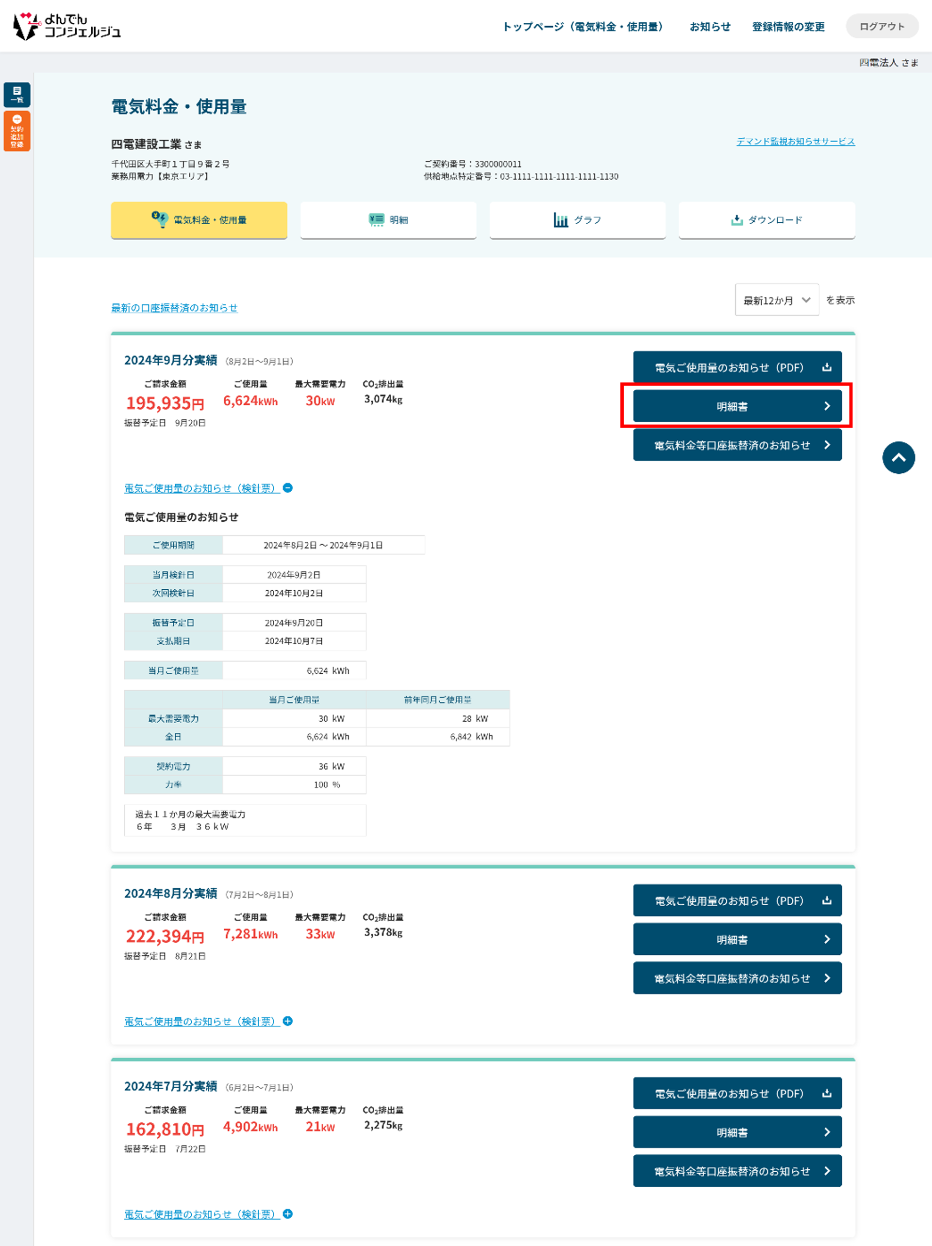- 「同一需要場所住所で複数契約ある場合」および「複数使用場所の契約の請求を集約している場合」については、上記書面は適格請求書の対象外となりますので、当社会員制Webサービス「よんでんコンシェルジュ」にご登録いただきますようお願いいたします。
