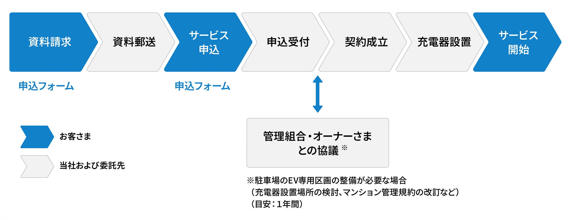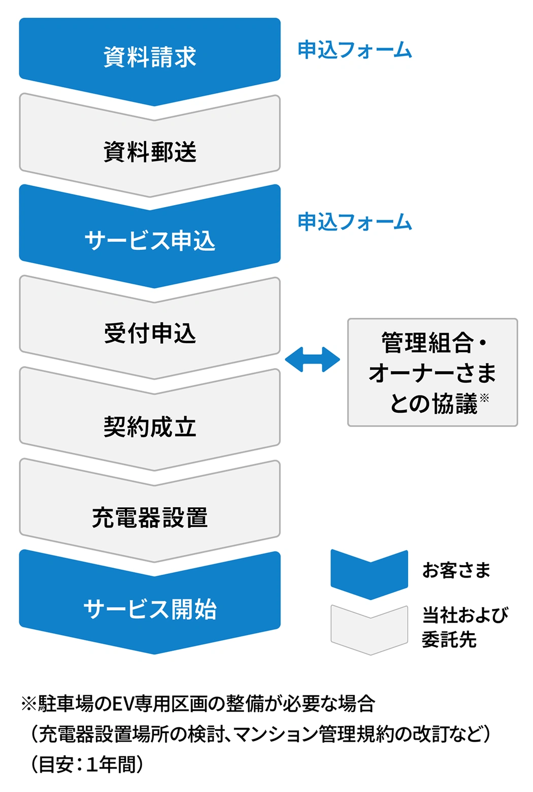 マンション利用者からのサービス申込み後、管理会社さま(分譲マンションの場合)、マンションオーナーさま(賃貸マンションの場合)を通してEV充電設備の設置について協議させていただきます。