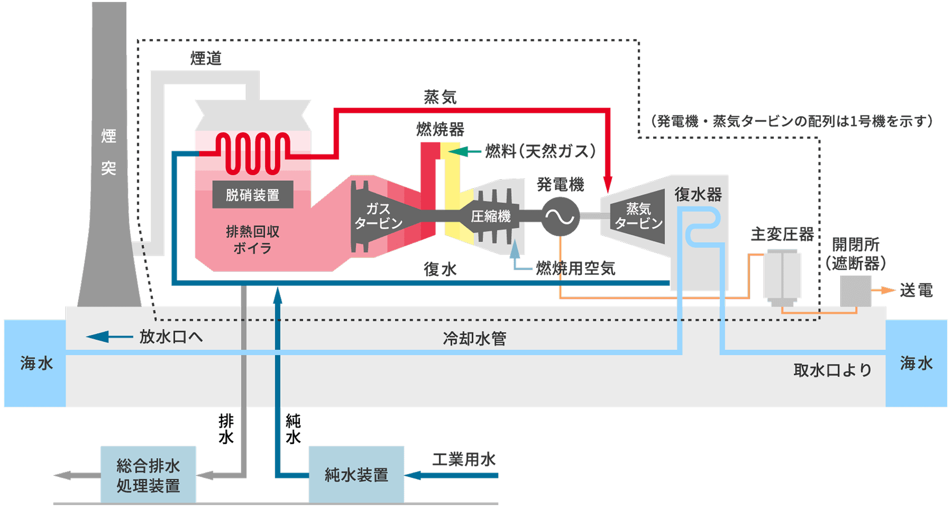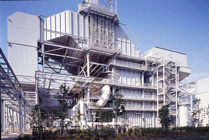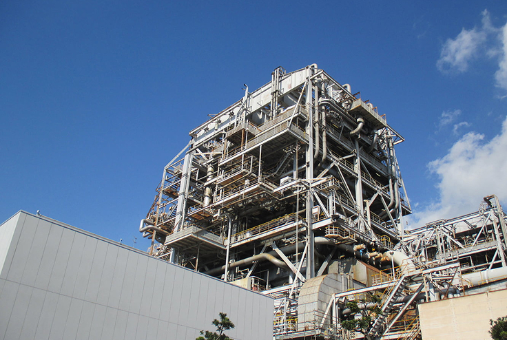 コンバインドサイクル発電方式は、ガスタービンと蒸気タービンを組み合わせた複合発電方式であり、LNGを気化した天然ガスを燃やしてガスタービンで発電した後、その高温ガスを排熱回収ボイラーに導き蒸気を発生させて蒸気タービンで発電することにより、高い発電効率を得ることができます。
