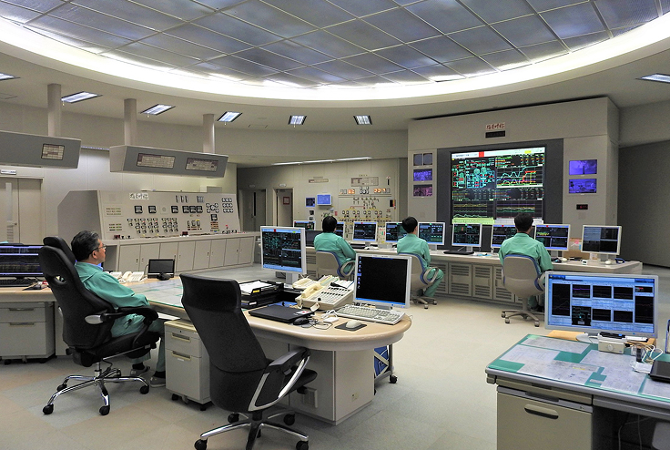 発電所の頭脳部。運転に必要な監視計器や操作装置が設置されています。自動制御装置により、ポンプやファンなどの機器を遠隔制御し、安全で効率の良い運転を行います。ここで働く運転員は、2 交替制で勤務しており、設備の状況の監視や発電所のパトロールに当たっています。