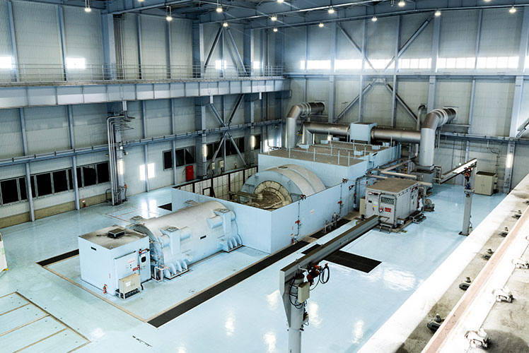 ボイラーから送られてきた蒸気は、タービンを回転させ、それに直結した発電機で電気が作られます。
