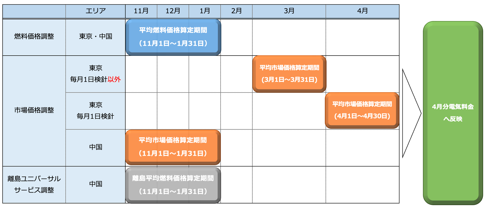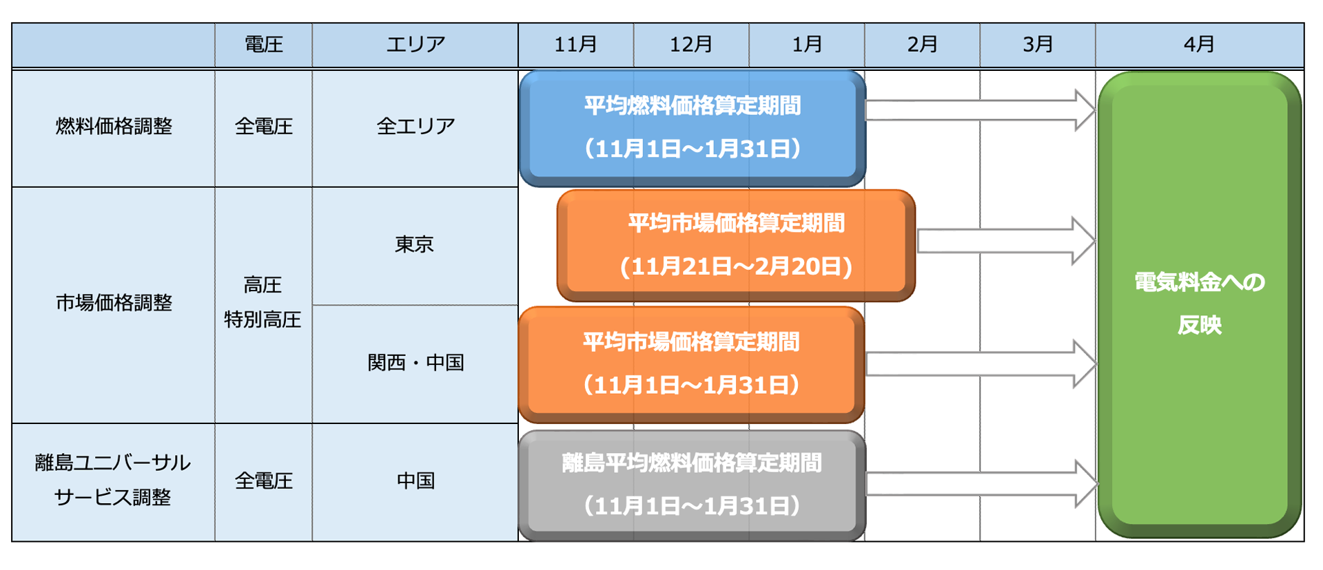 料金表に定められた算定期間の平均燃料価格、平均市場価格、および離島平均燃料価格を電気料金へ反映いたします。