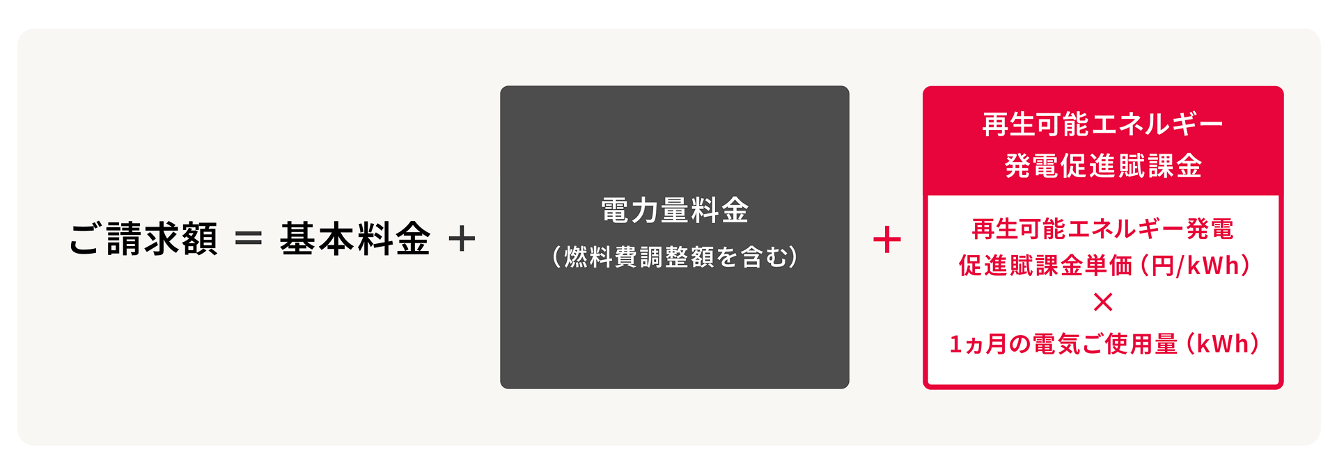 - 再生可能エネルギー発電促進賦課金は、年度ごとに定められる「再生可能エネルギー発電促進賦課金単価」と、お客さまごとの「1か月の電気ご使用量」とを乗じて算定いたします。