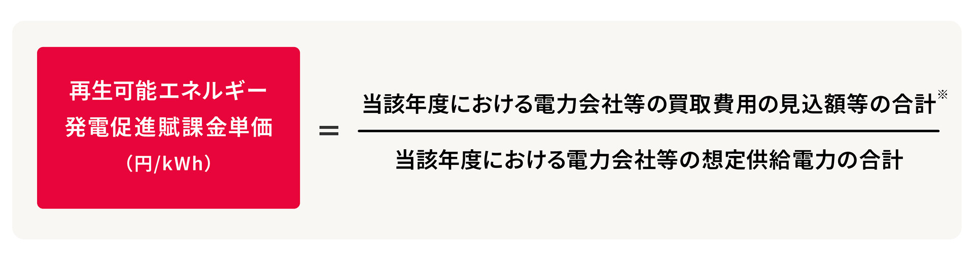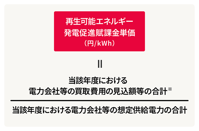 - 再生可能エネルギー発電促進賦課金単価は、再生可能エネルギーの固定価格買取制度にもとづき、当該年度における電力会社等の買取費用の見込額相当をもとに、当該年度のご負担に適用する単価が算定されます。