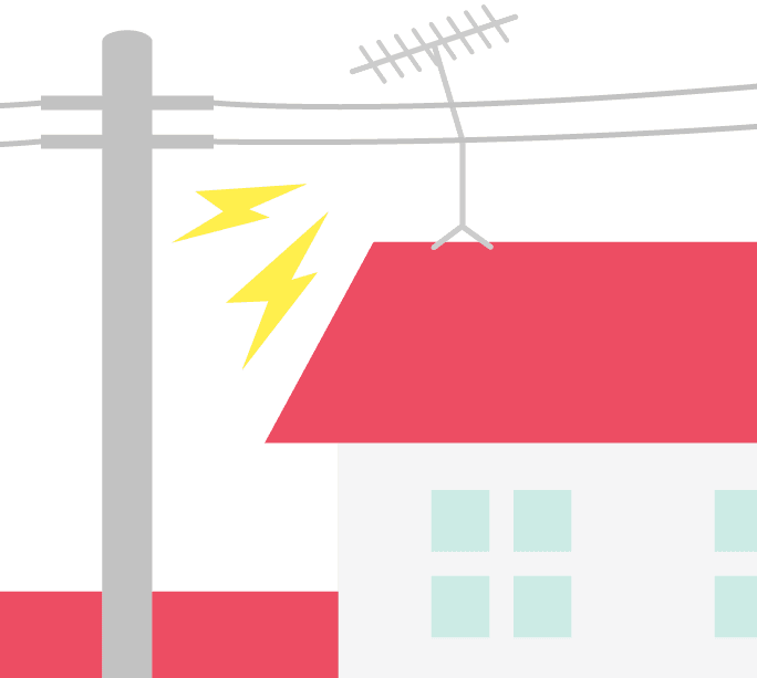 アンテナなどが強風で倒れ、電線に触れると危険です。古いアンテナや風でよく揺れるアンテナ、また、支線の切れているアンテナは、電気店に相談して早めに点検・修理してもらいましょう。