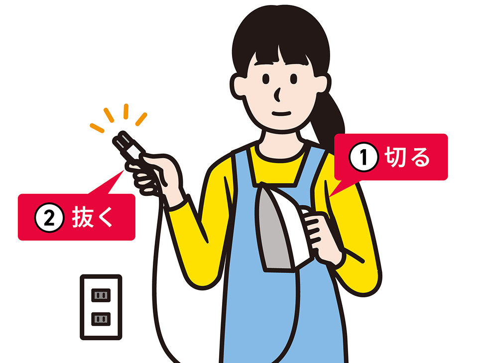電気ストーブやアイロンなどの電熱器具は、火災の原因になりやすいので、すぐにスイッチを切ってコンセントからプラグを抜いてください。