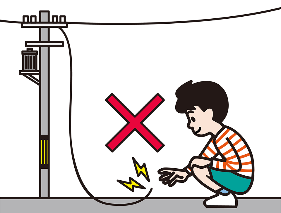 切れて垂れ下がった電線には絶対にさわらないでください。