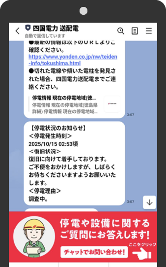 - 停電の原因判明時、復旧時間(見込み)や状況が変わった時に表示