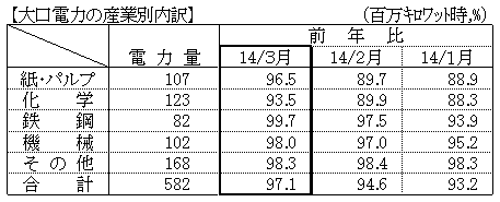 - 大口電力は、化学などにおける生産減から、対前年比 97.1%となった。