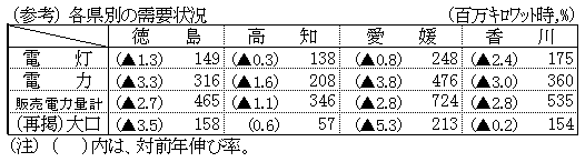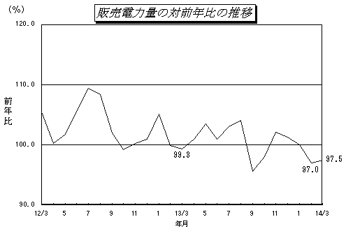 - 電灯,業務用電力,小口電力については、気温が前年に比べて高めに推移したことなどから、対前年比は各々 98.8%,98.4%,94.7%となった。