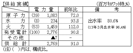 - 原子力は、伊方1号機が定期検査中のため、対前年比 72.0%となった。
