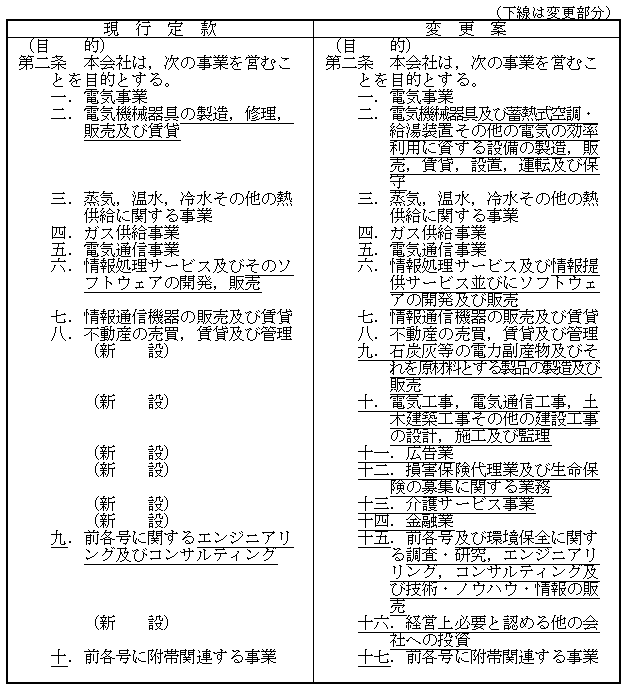 ○ なお、上記事業目的の追加のほか、昨年の商法改正等により、額面株式の廃止、単元株制度の創設、消却特例法の廃止等がなされたことから、所要の変更なども合わせて実施いたします。