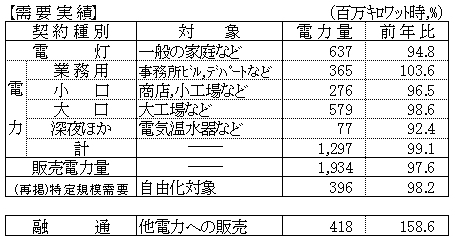 電灯は、6億3千7百万キロワット時、対前年比 94.8%、電力は、12億9千7百万キロワット時、対前年比 99.1%となり、販売電力量では、19億3千4百万キロワット時、対前年比 97.6%となった。