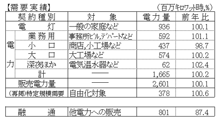 電灯は、9億3千6百万キロワット時、対前年比 100.1%、電力は、16億6千5百万キロワット時、対前年比 100.2%となり、販売電力量では、26億1百万キロワット時、対前年比 100.1%となった。