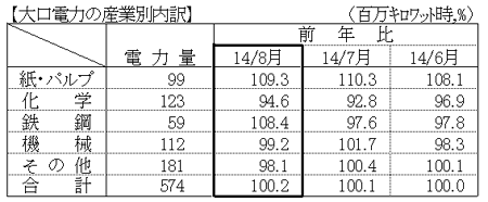 - 大口電力は、化学などにおいて生産減となったものの、紙・パルプが堅調なことから、対前年比は 100.2%となった。