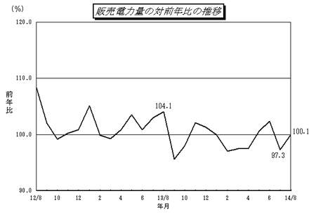 - 電灯,小口電力は、7月下旬から8月中旬にかけての気温が前年に比べ低めに推移したことから、対前年比は各々100.1%,98.7%となった。
