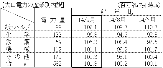- 大口電力は、化学において生産減となったものの、鉄鋼や紙・パルプが堅調なことから、対前年比は 101.8%となった。(4ケ月連続プラス)