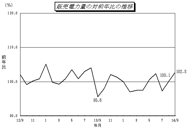 - 電灯,業務用・小口電力は、残暑影響により9月の気温が前年に比べ高めに推移したことから、対前年比は各々101.8%,106.1%,102.4%となった。
