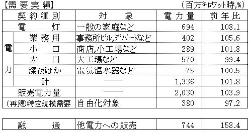 電灯は、6億9千4百万キロワット時、対前年比 108.1%、電力は、13億3千6百万キロワット時、対前年比 101.8%となり、販売電力量では、20億3千万キロワット時、対前年比 103.9%となった。