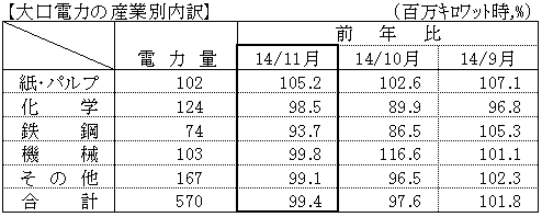 - 大口電力は、化学や鉄鋼における生産減などから、対前年比は 99.4%となった。(2ヵ月連続マイナス)