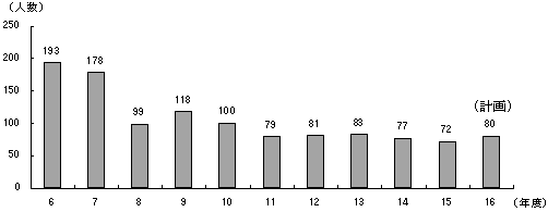 [平成16年度の採用規模はピーク時(昭和55〜57年度)の約1/4の水準]