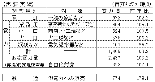 電灯は、9億7千2百万キロワット時、対前年比 102.2%、電力は、14億6千5百万キロワット時、対前年比 103.9%となり、販売電力量では、24億3千7百万キロワット時、対前年比 103.2%となった。