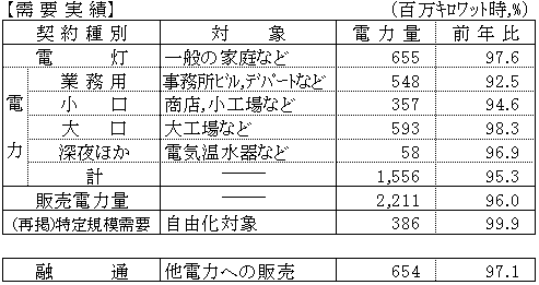 電灯は、6億5千5百万キロワット時、対前年比97.6%、電力は、15億5千6百万キロワット時、対前年比95.3%となり、販売電力量では、22億1千1百万キロワット時、対前年比96.0%となった。(2ヶ月連続前年割れ)