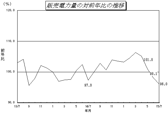 - 電灯、業務用電力、小口電力は、7月の気温が前年に比べ低めに推移したことから、対前年比は各々97.6%、92.5%、94.6%となった。
