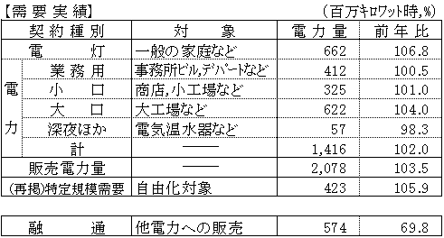 電灯は、6億6千2百万キロワット時、対前年比106.8%、電力は、14億1千6百万キロワット時、対前年比102.0%となり、販売電力量では、20億7千8百万キロワット時、対前年比103.5%となった。
