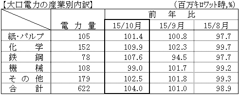 - 大口電力は、化学や鉄鋼で前年の設備補修の影響もあって、対前年比は104.0%となった。(2ヶ月連続のプラス)