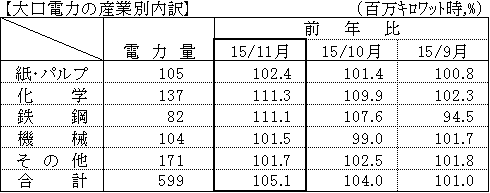 - 大口電力は、化学や鉄鋼における生産増などから、対前年比は105.1%となった。(3ヶ月連続のプラス)