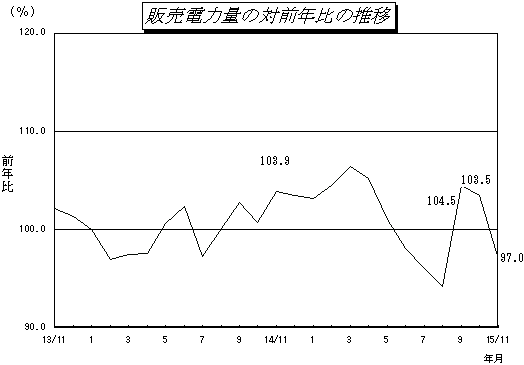 - 電灯、業務用・小口電力は、11月の気温が前年に比べ高めに推移したことから、対前年比は各々92.2%,97.4%,95.2%となった。