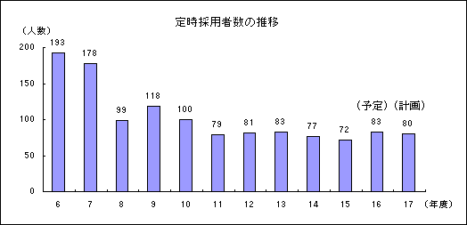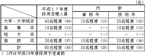 平成17年度の定時採用につきましては、要員のスリム化を進めるとともに、将来にわたる技術力、営業提案力の確保にも十分配慮するなど、競争力強化の観点から総合的に検討した結果、昨年と同規模の80名程度の計画といたします。