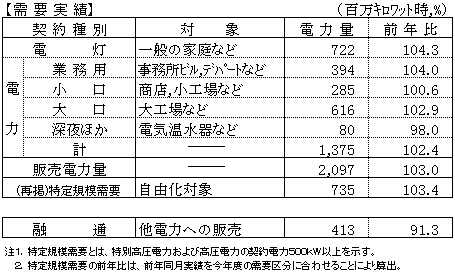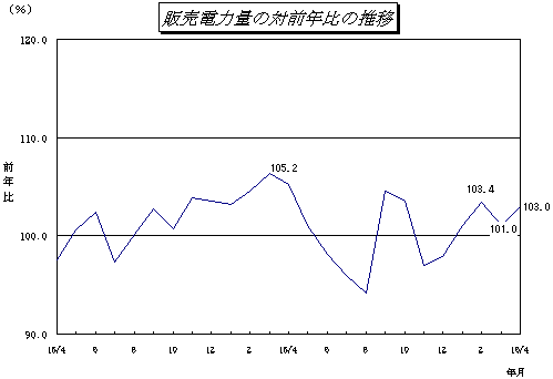 - 電灯、業務用電力の対前年比は、各々104.3%、104.0%と、堅調な伸びとなった。