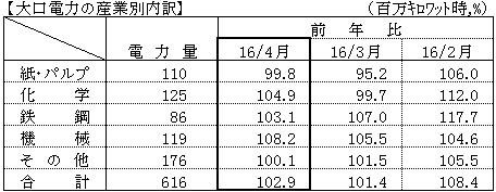 - 大口電力は、化学・機械における生産増などから、対前年比は102.9%となった。 (8ヶ月連続のプラス)